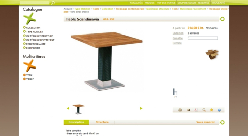 Vente de mobilier d'intérieur et d'extérieur hautement configurable (matériaux, couleurs, options, ...)